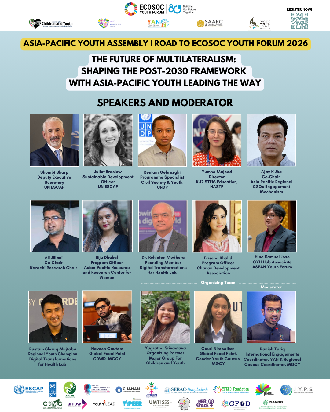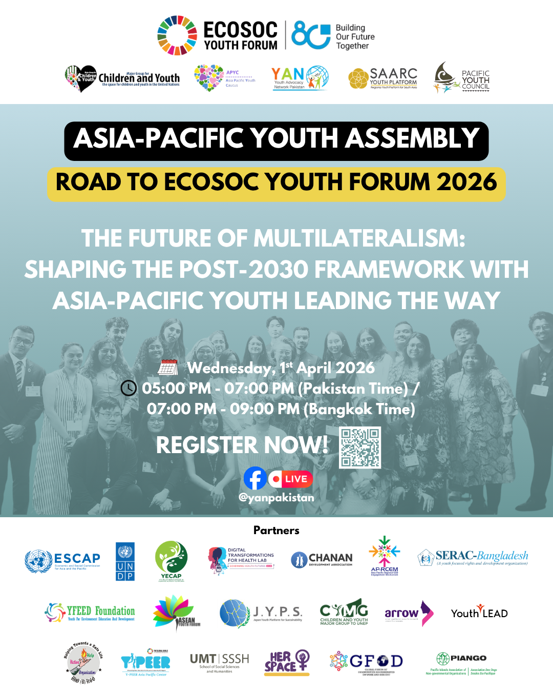 Join MGCY, the Asia Pacific Youth Caucus, YAN Pakistan, the SAARC Youth Platform, and the Pacific Youth Council and partners for the Asia Pacific Youth Assembly ahead of the 2026 ECOSOC Youth Forum. The theme is "The Future of Multilateralism: Shaping the post-2030 Framework with Asia-Pacific Youth Leading the Way".