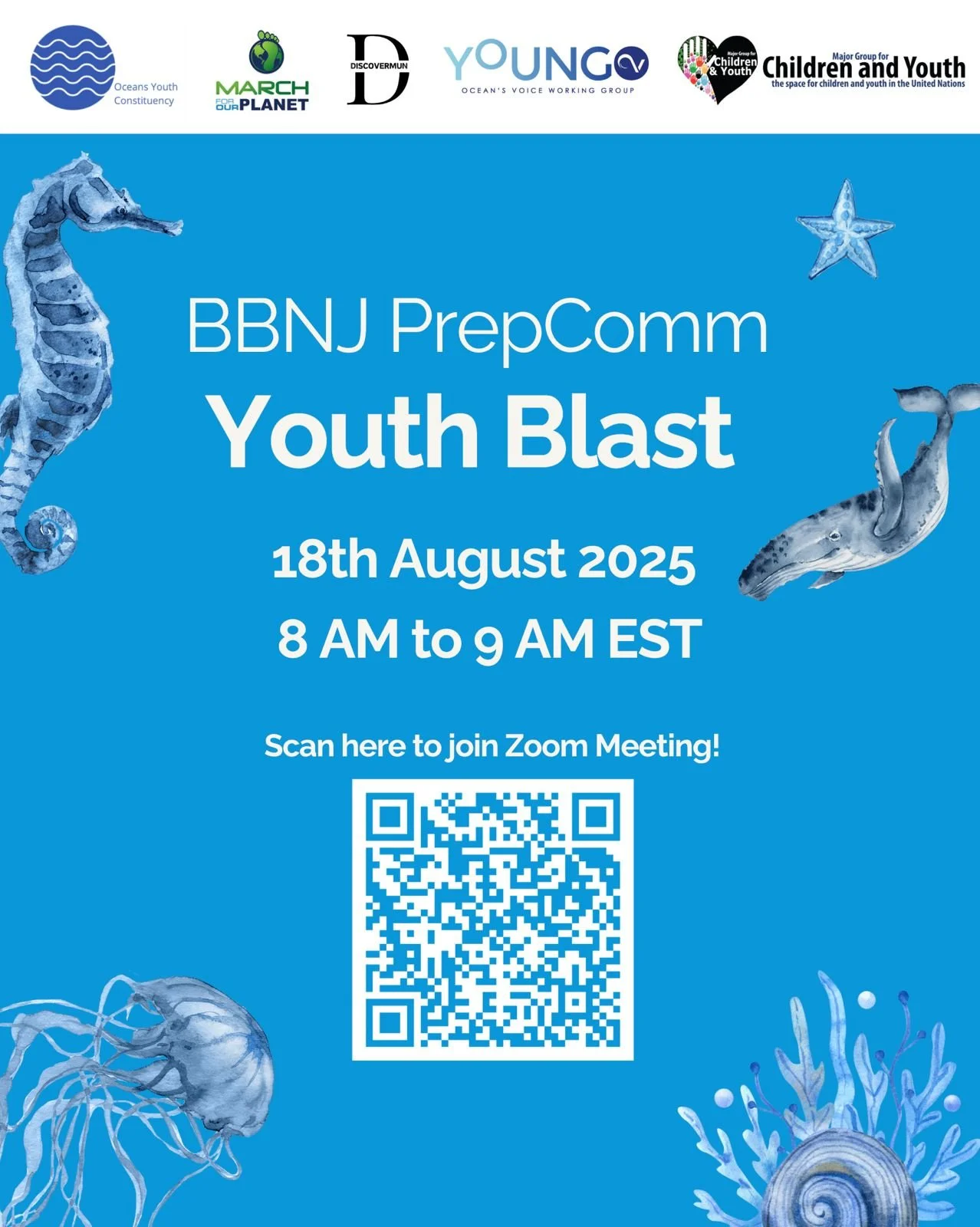 Youth for Oceans! This #YouthBlast is your space to build skills, plan interventions & strategize for upcoming BBNJ PrepComm! Scan below to join the Zoom Meeting!