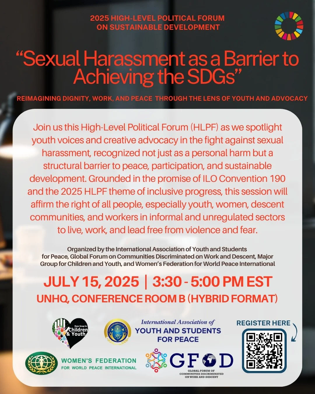Summary: Aligned with the 2025 HLPF theme, this side event will examine how addressing workplace and sexual harassment in informal and unregulated spaces—such as beauty pageants, descent communities, fashion shows, and influencer campaigns—is critical to achieving SDGs 5, 8, and 16. It will spotlight ILO Convention 190 as a key global standard to eliminate violence and harassment in the world of work. The event will also feature survivor stories and highlight the power of youth-led storytelling and advocacy to shift systems and challenge harmful norms.