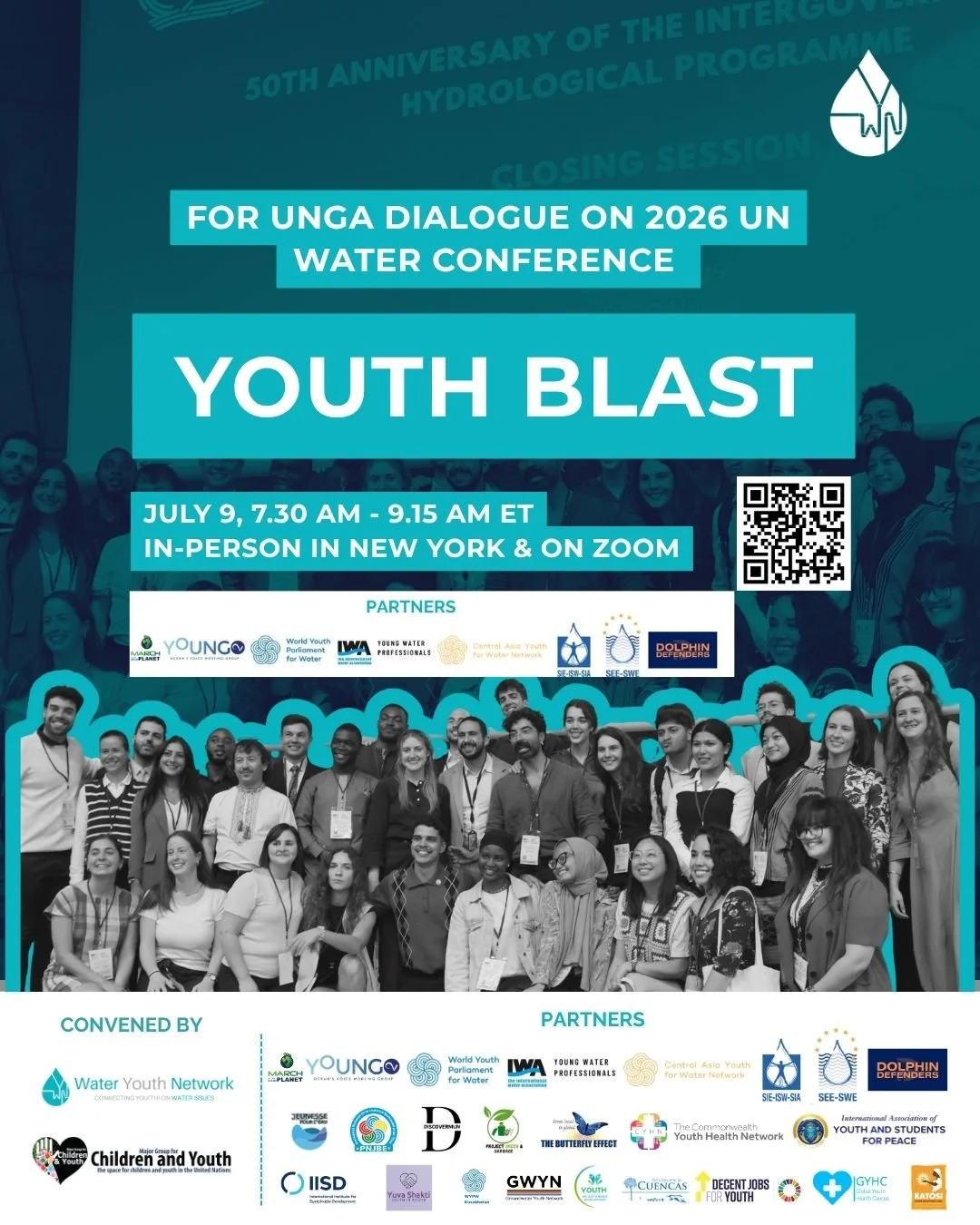 The Water Youth Network (WYN) and the Major Group for Children & Youth (MGCY) invite young people to join the Youth Blast—a space to share your voice and perspectives on water ahead of the 2026 UN Water Conference. Whether you work on WASH, water diplomacy, climate, or beyond, this is a moment to speak up and contribute to shaping youth priorities for #Youth4Water!
